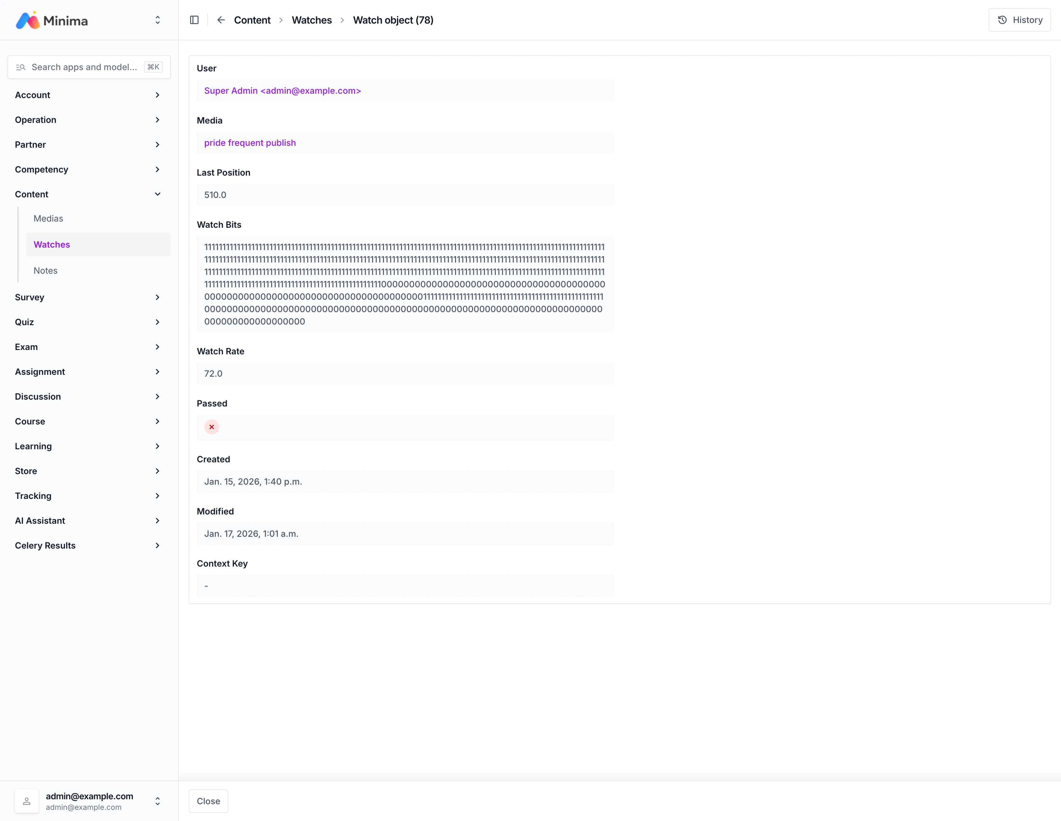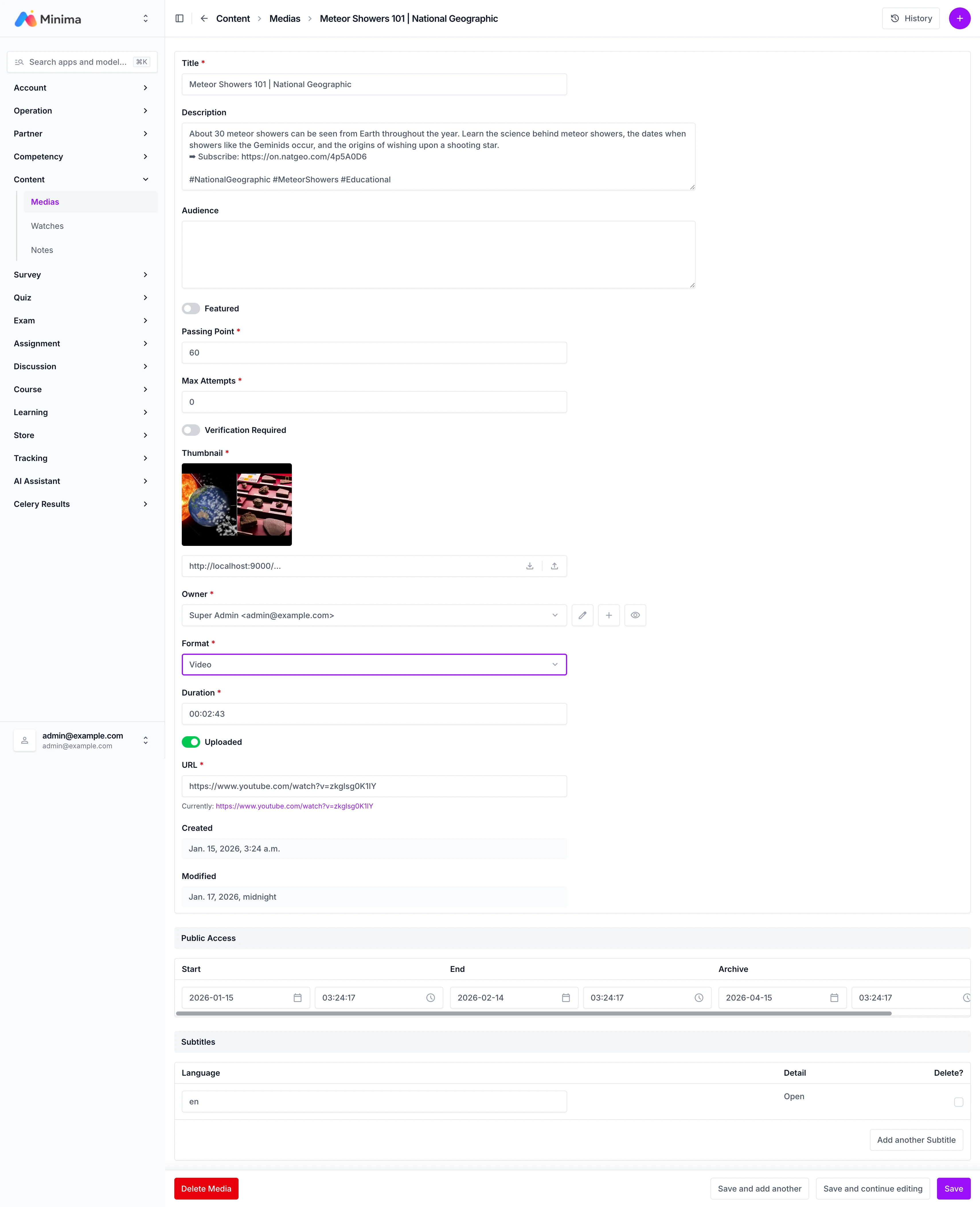 In Minima LMS, all content requires enrollment to access. Enrollment is managed in the "Learning" app. Content without enrollment can be searched but detailed content cannot be accessed. As an exception, media content can be set to "Public Access", allowing logged-in learners to view content immediately after searching.
