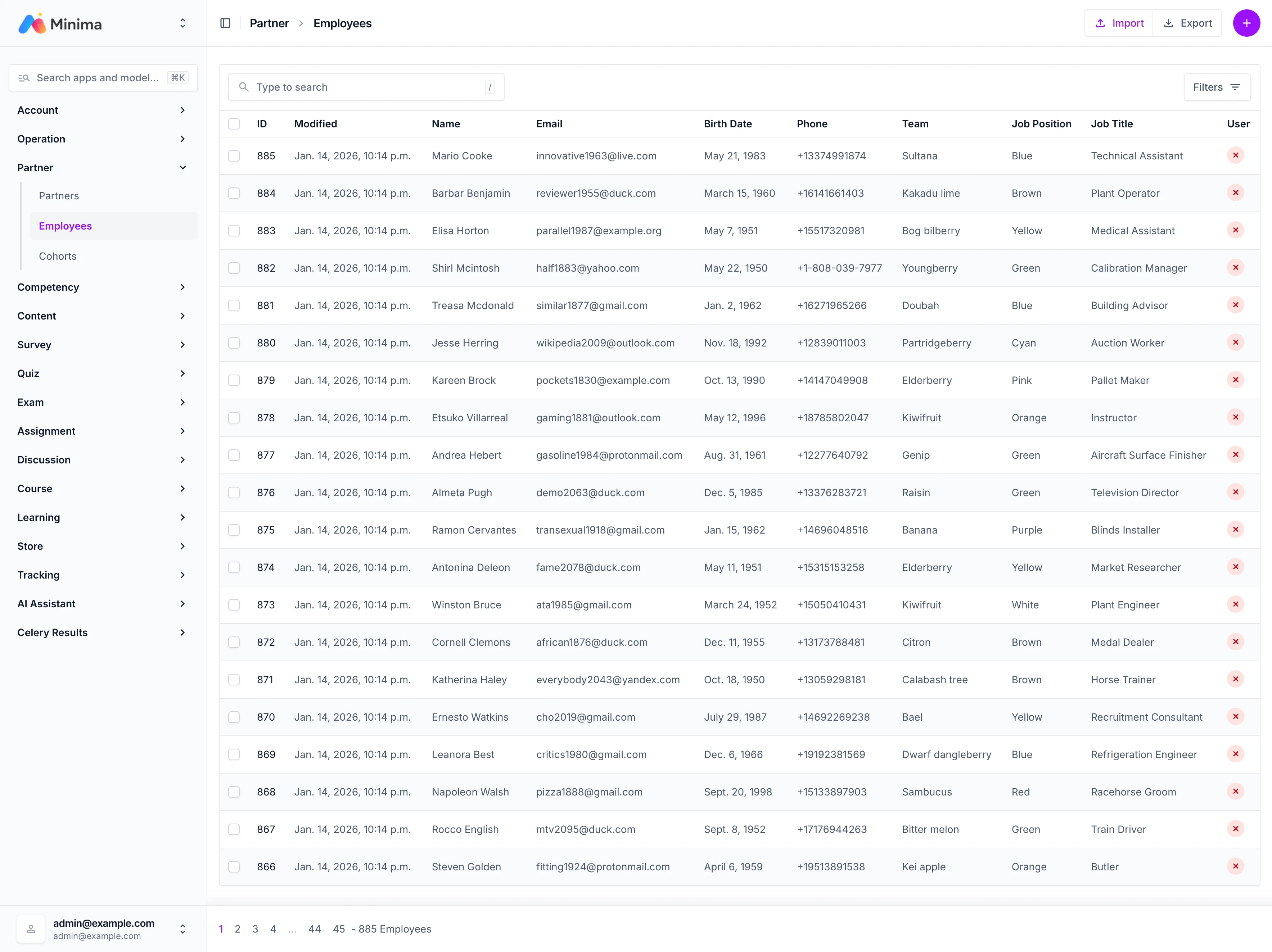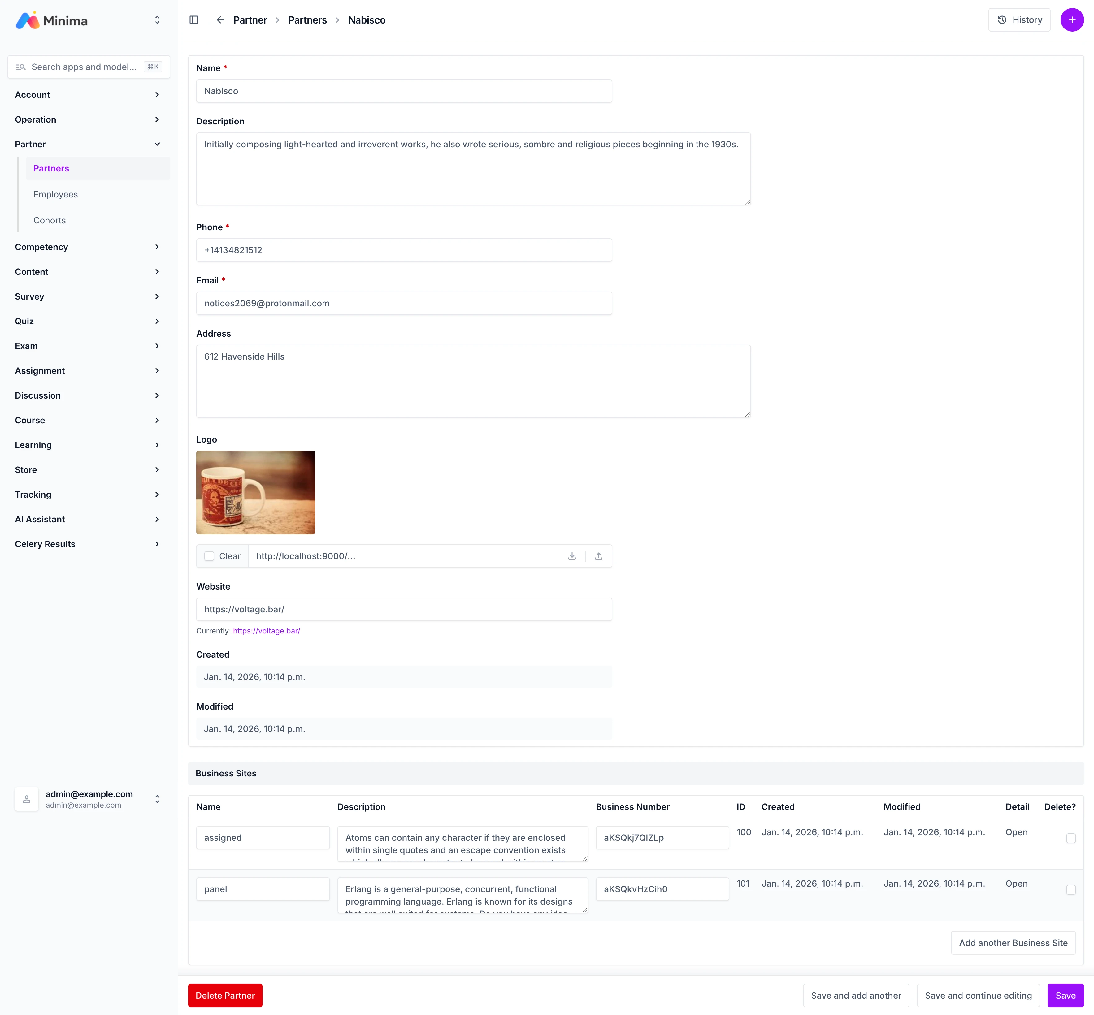 Partners can be added to Minima LMS. Partners have employees who are enrolled in learning groups. Learning groups can have catalogs. Partner employees can freely access content within the catalogs that their learning groups have. Catalogs are managed in the 'Learning' app.