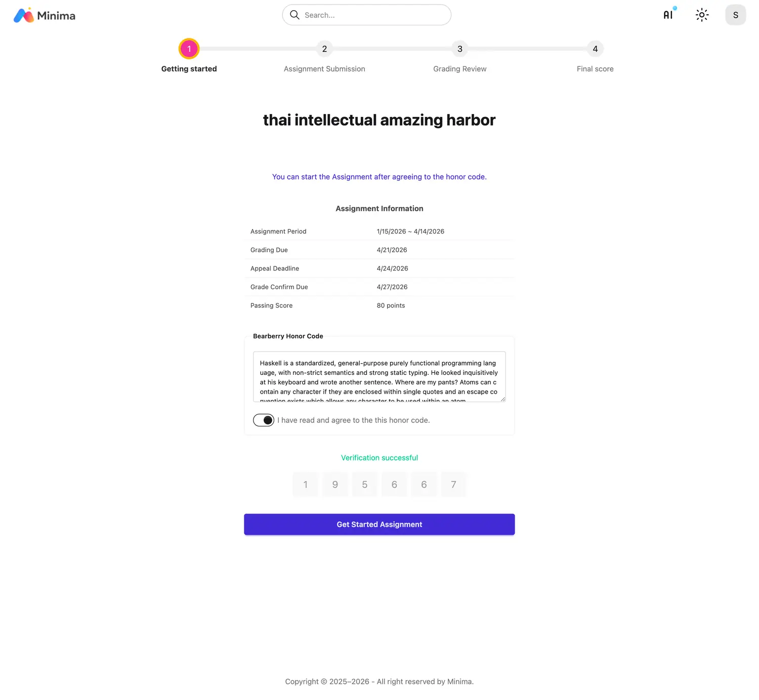 - Agree to the compliance requirements and authenticate before starting the assignment.
