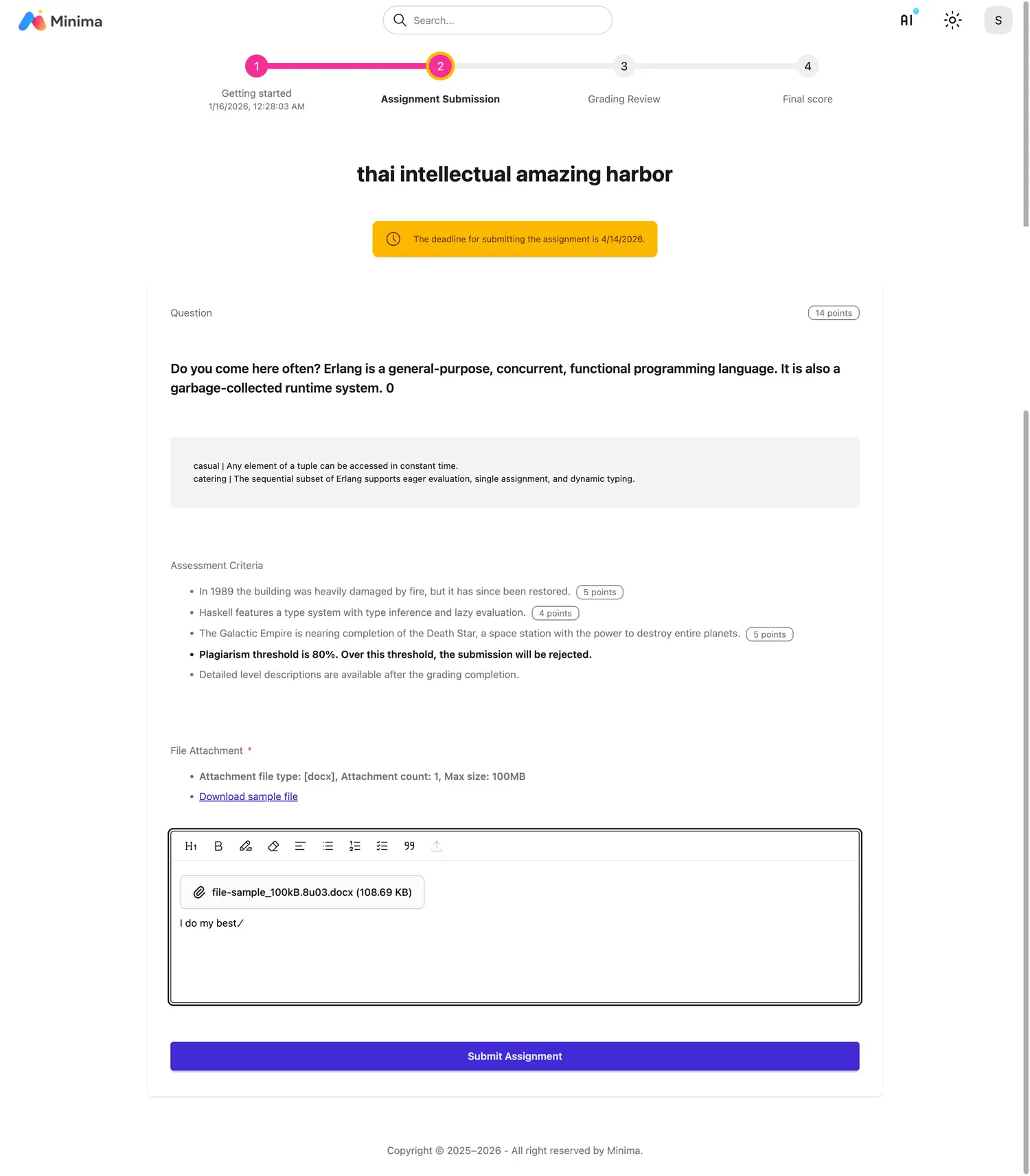A plagiarism check is performed when you submit an assignment. If it meets the plagiarism criteria set for the assignment, you cannot submit it.