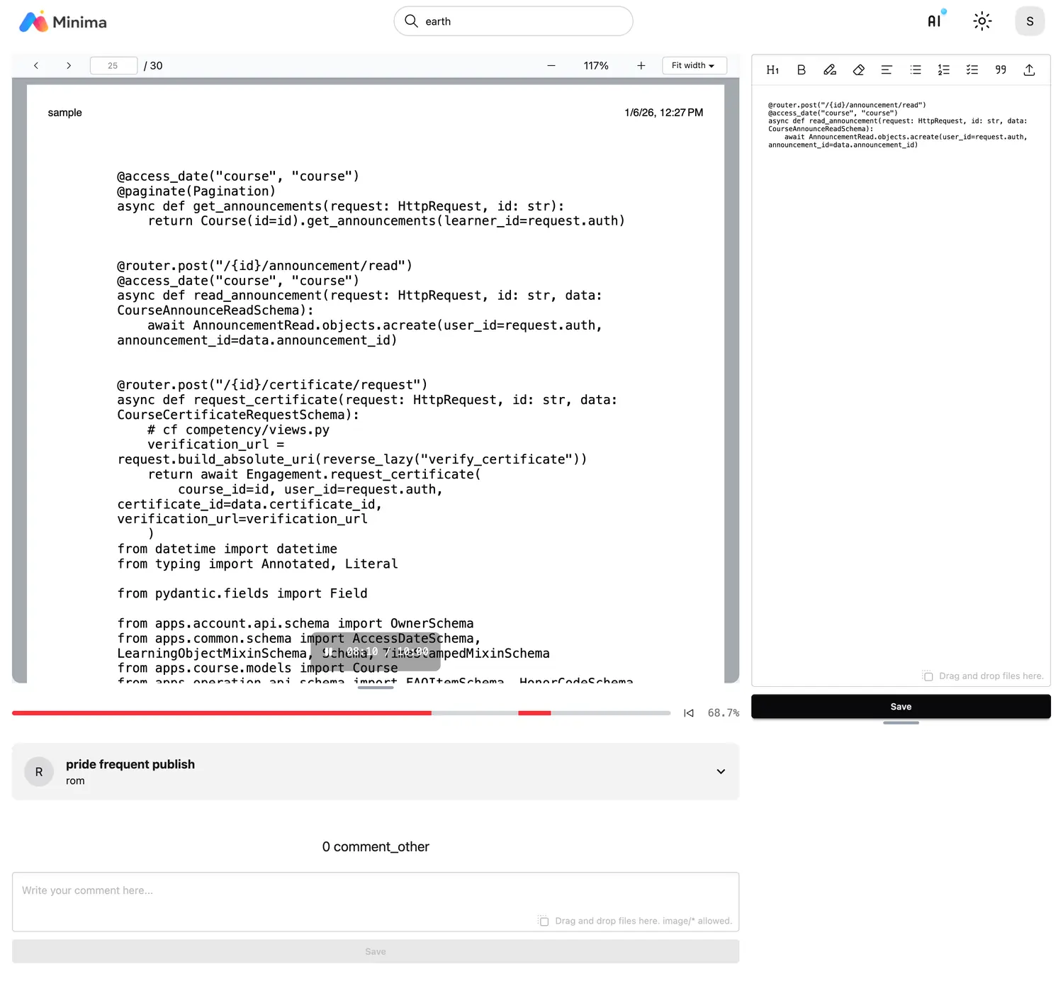 PDF PDF Playback PDFs are played like videos by applying time to PDF viewing. Learning Time Tracking Viewing time is tracked and saved by the second at the actual playback position, and progress is calculated only by the actual playback position.