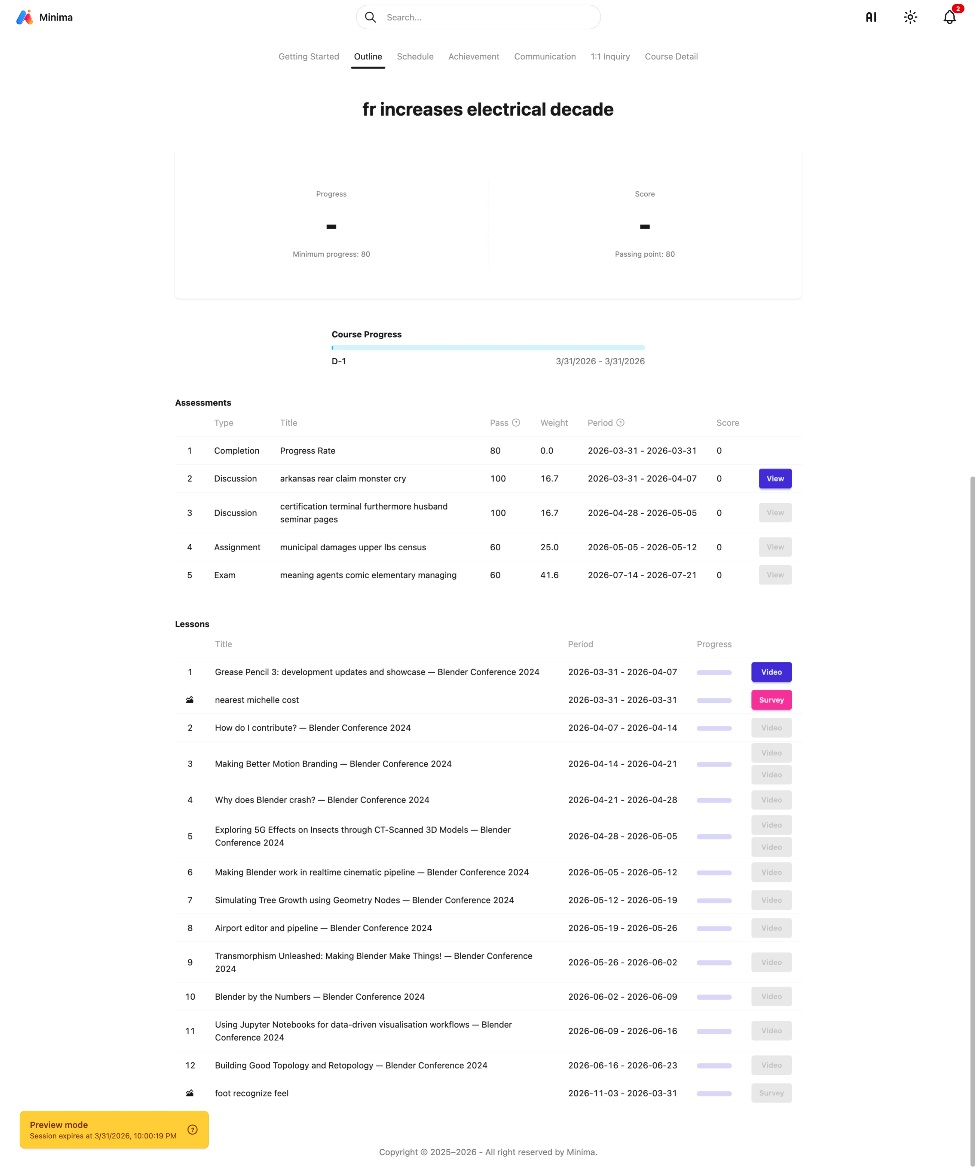 Every field that references another object — exam, assignment, discussion, video, survey, instructor, certificate — uses inline autocomplete. The full list loads once on first interaction and filters instantly as you type. Adding a lesson or an assessment is a single click.