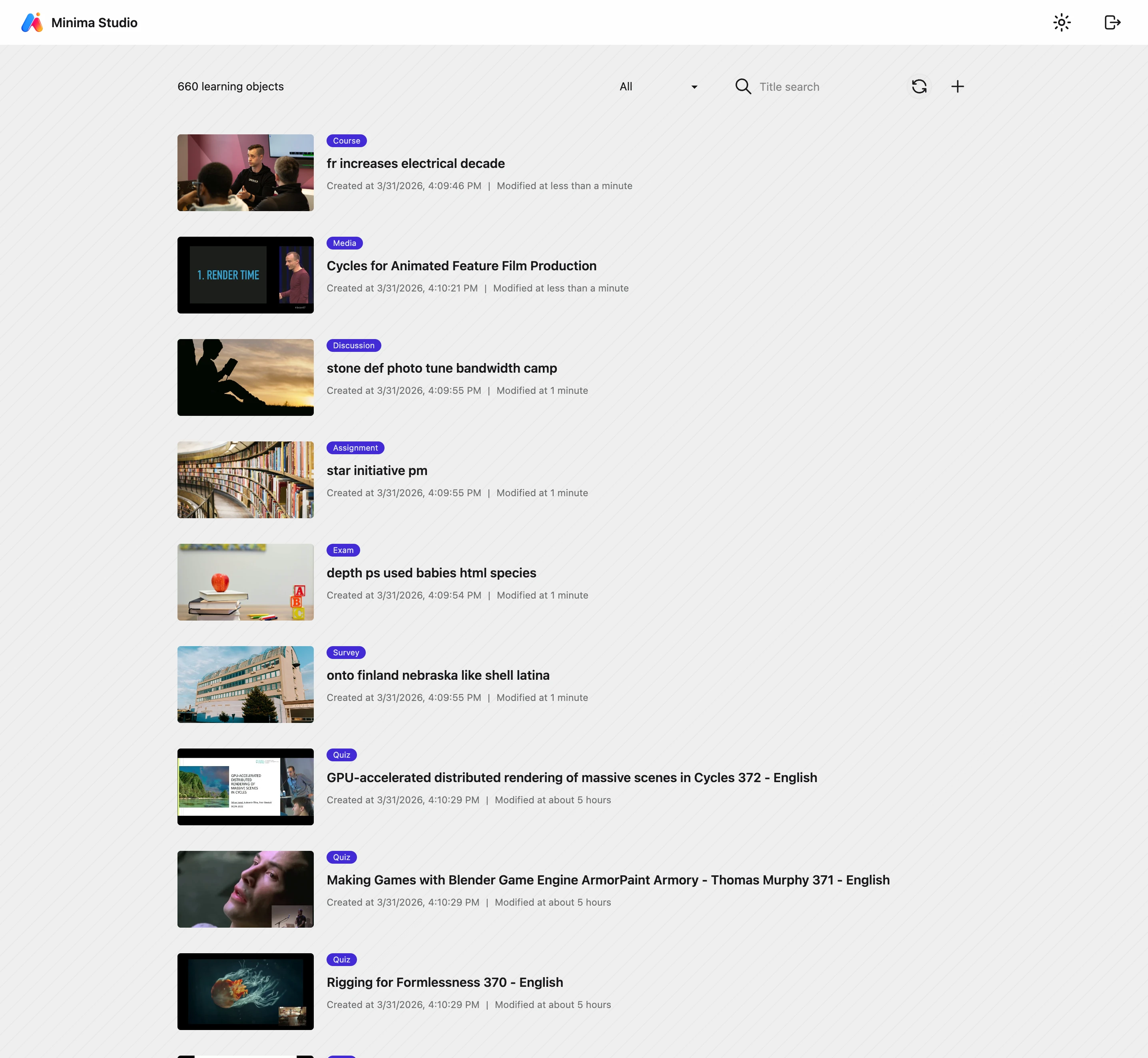 Studio is built around the idea that content creation should be fast and frictionless. Every learning object — exam, assignment, discussion, quiz, survey, video — is created, edited, and managed in a single interface. Nothing requires a page reload. Draft state persists as you move between items, so switching to another content and coming back keeps your unsaved work intact.