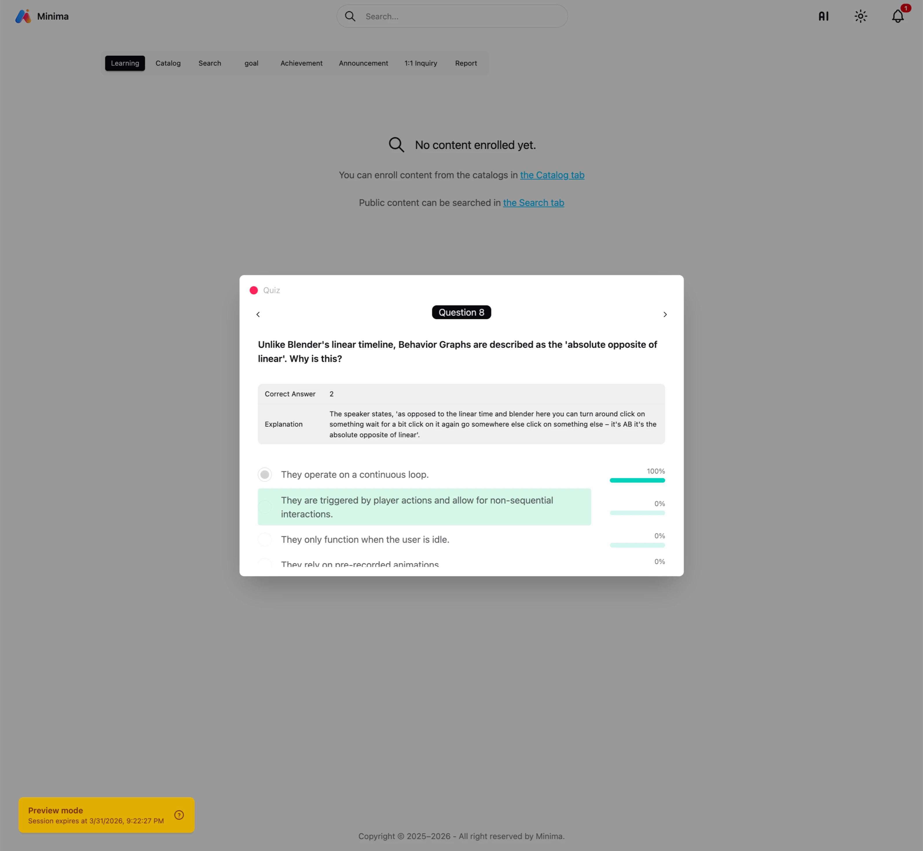 Quiz CRUD operations for quizzes. Export and import via CSV. Bulk copy questions from the question bank. Test without restrictions in preview mode. Preview